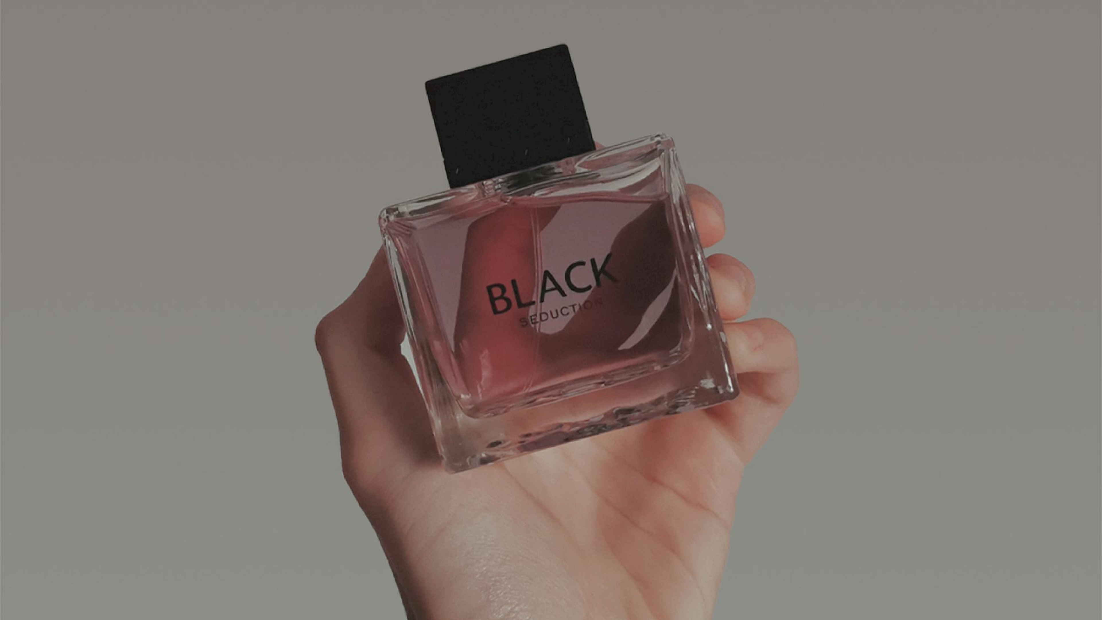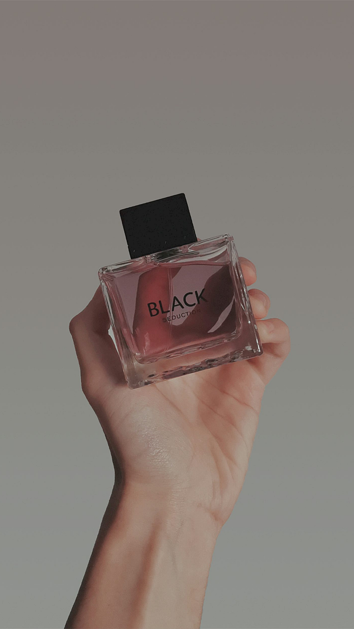 A captivating wallpaper featuring a hand delicately holding a bottle of alluring black perfume. Mysterious and elegant, perfect for a sophisticated aesthetic.