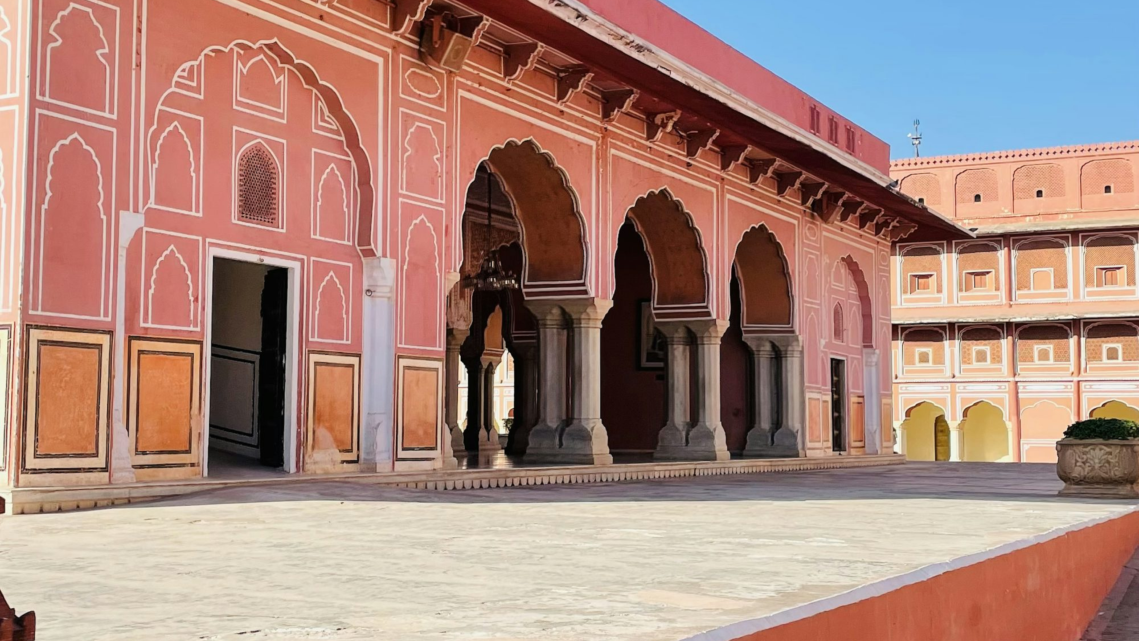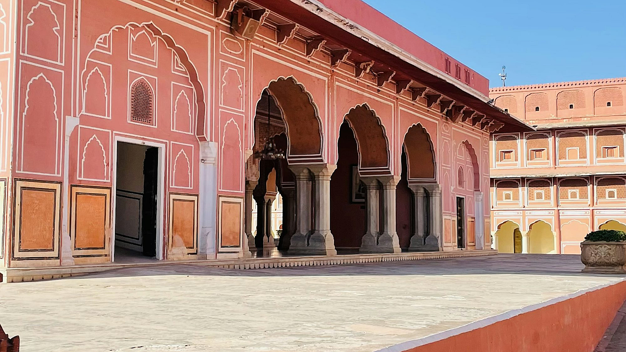 This wallpaper features a charming pink building adorned with intricate arches, creating a visually appealing and aesthetically pleasing backdrop for your devices.