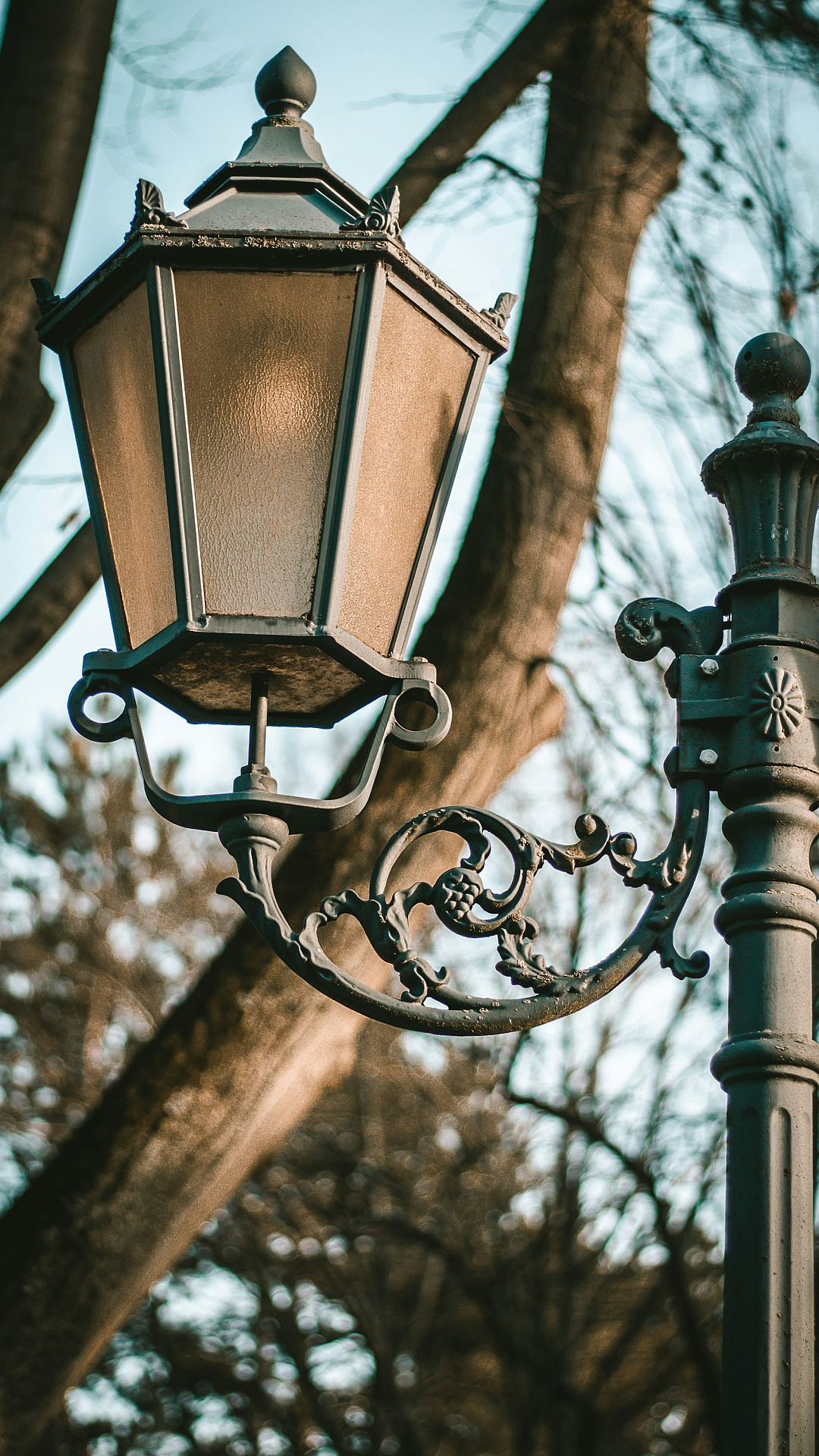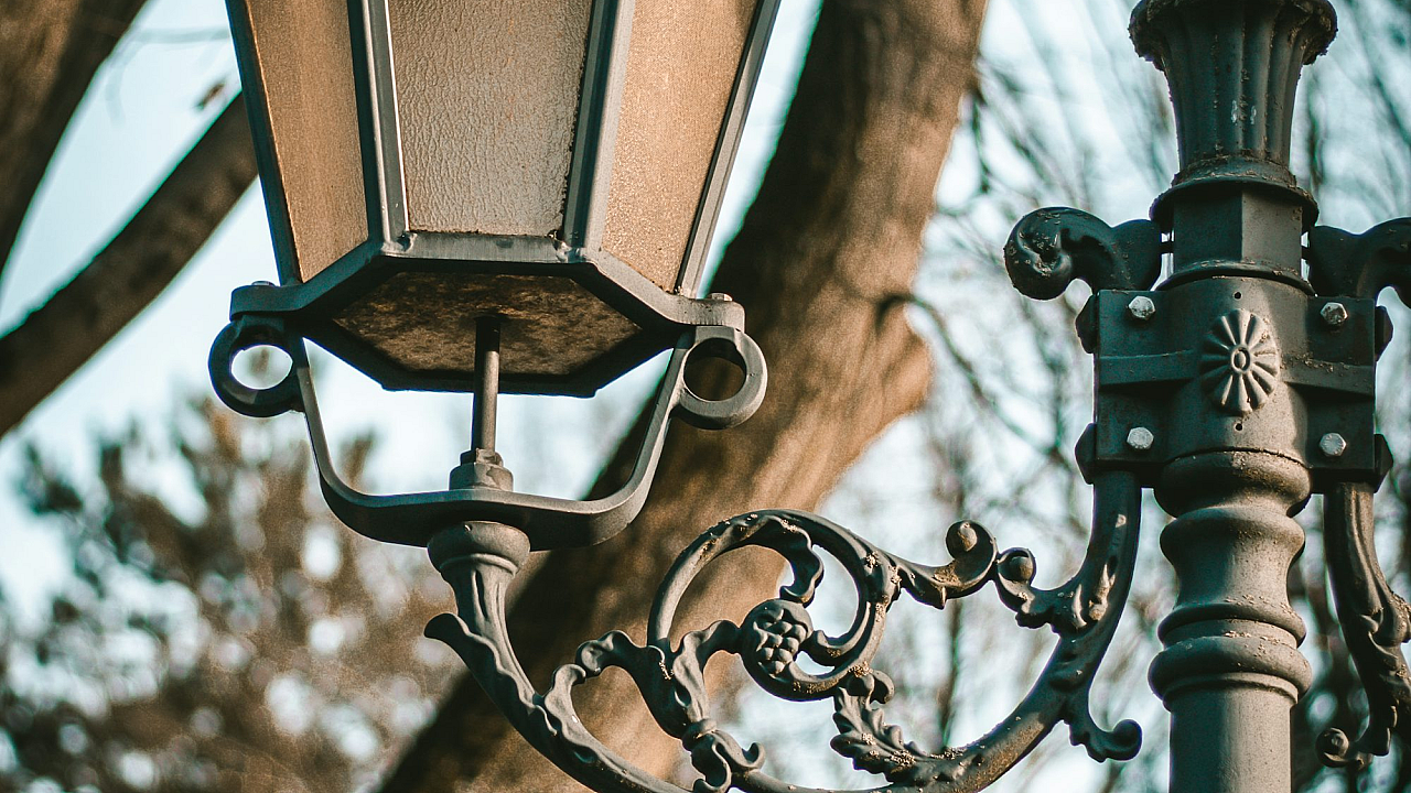 A dramatic wallpaper featuring a black metal framed lamp post, perfect for adding a touch of gothic or industrial style to your desktop or device.