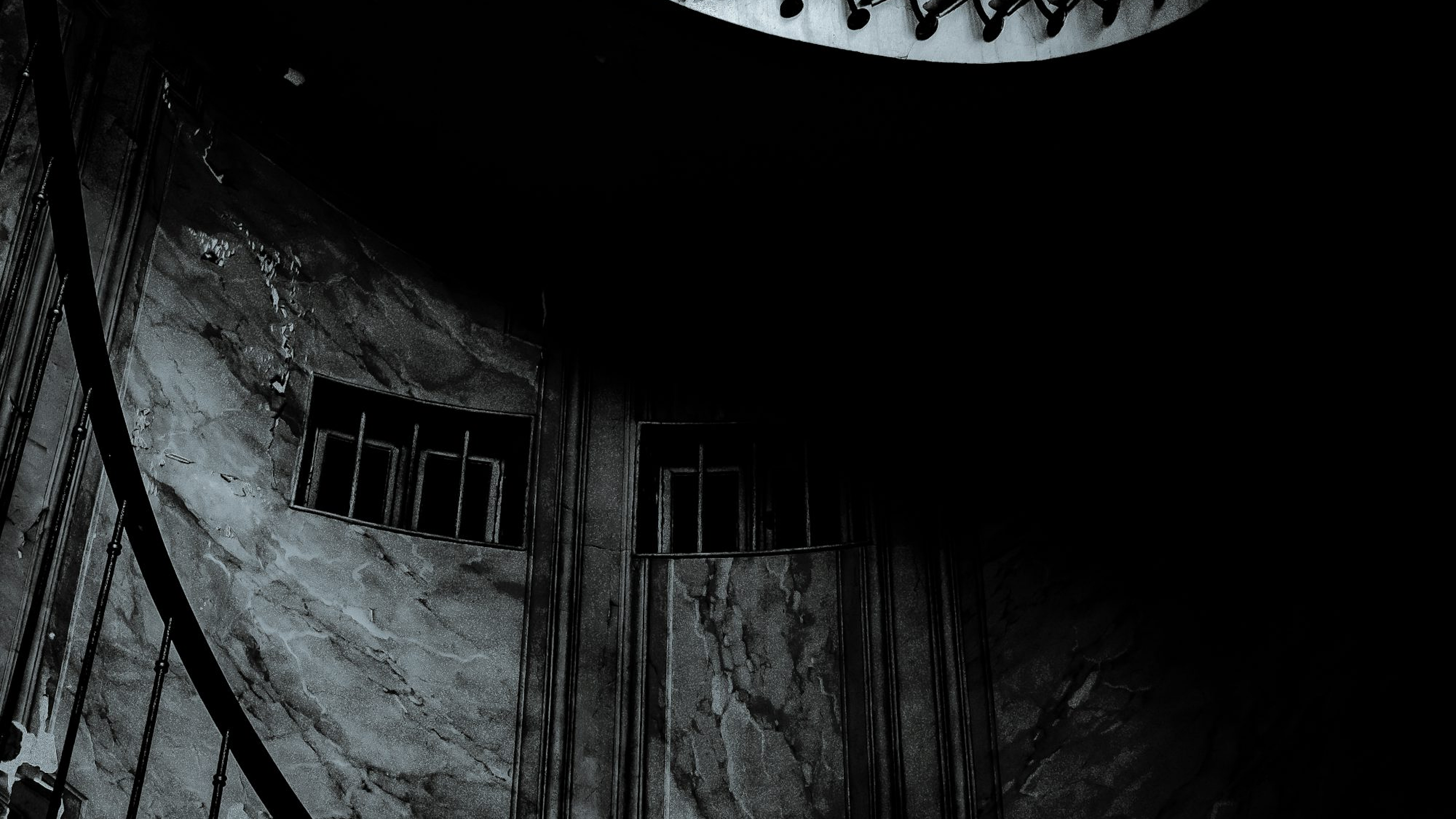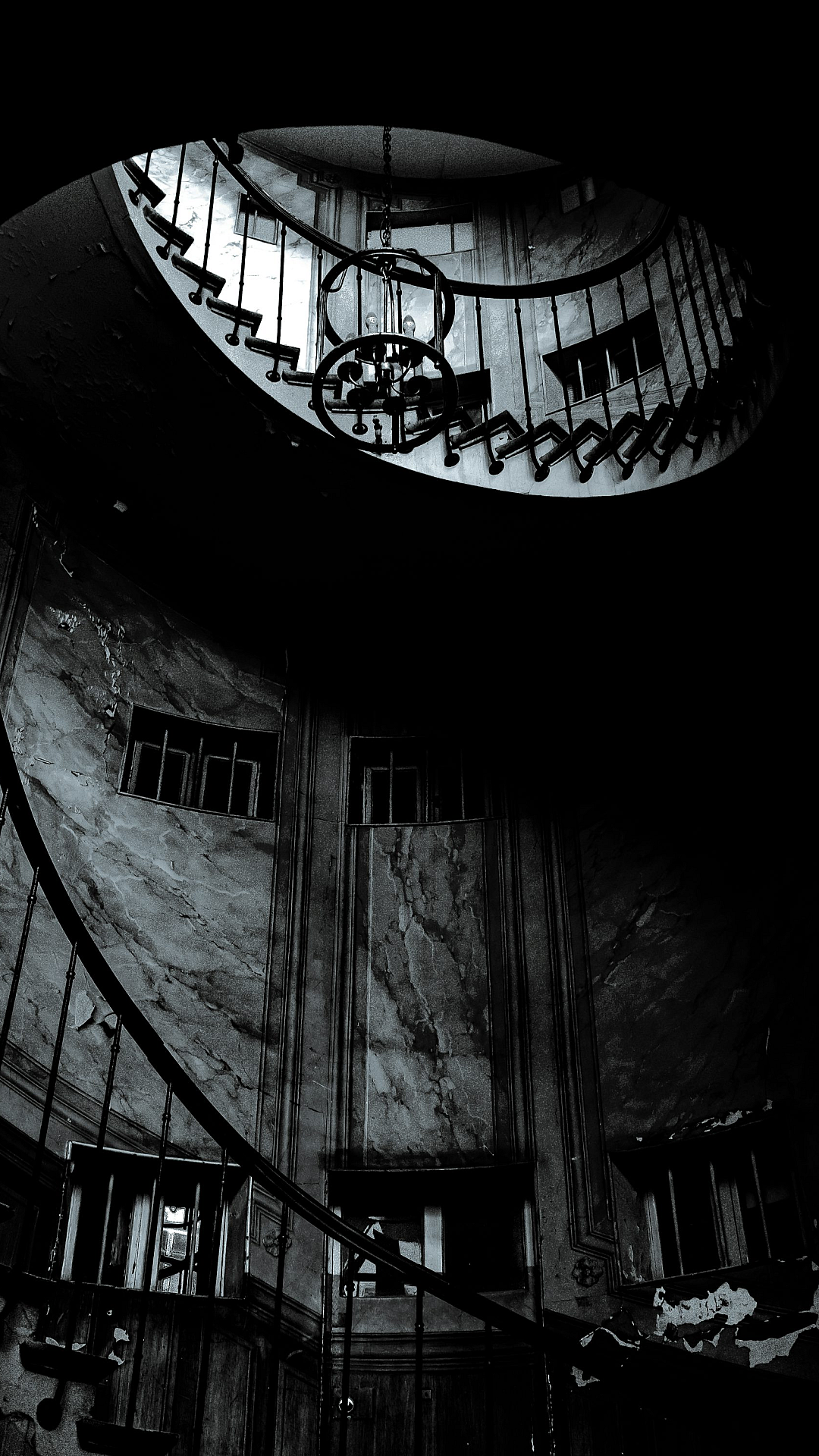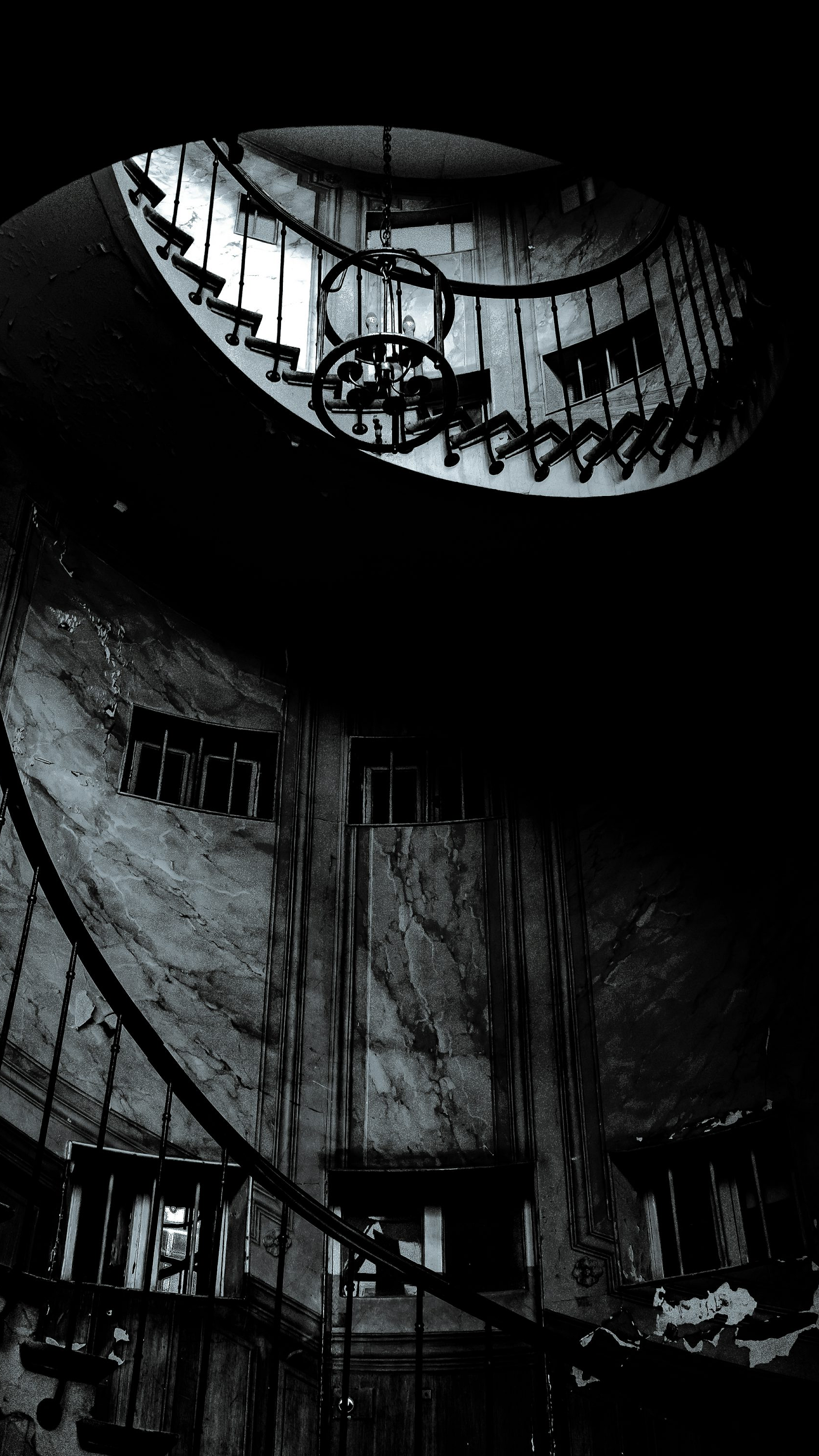 black spiral staircase, black metal railings, spiral staircase wallpaper, dark wallpaper, gothic wallpaper, modern wallpaper, interior wallpaper, architecture wallpaper, staircase design, black and white wallpaper