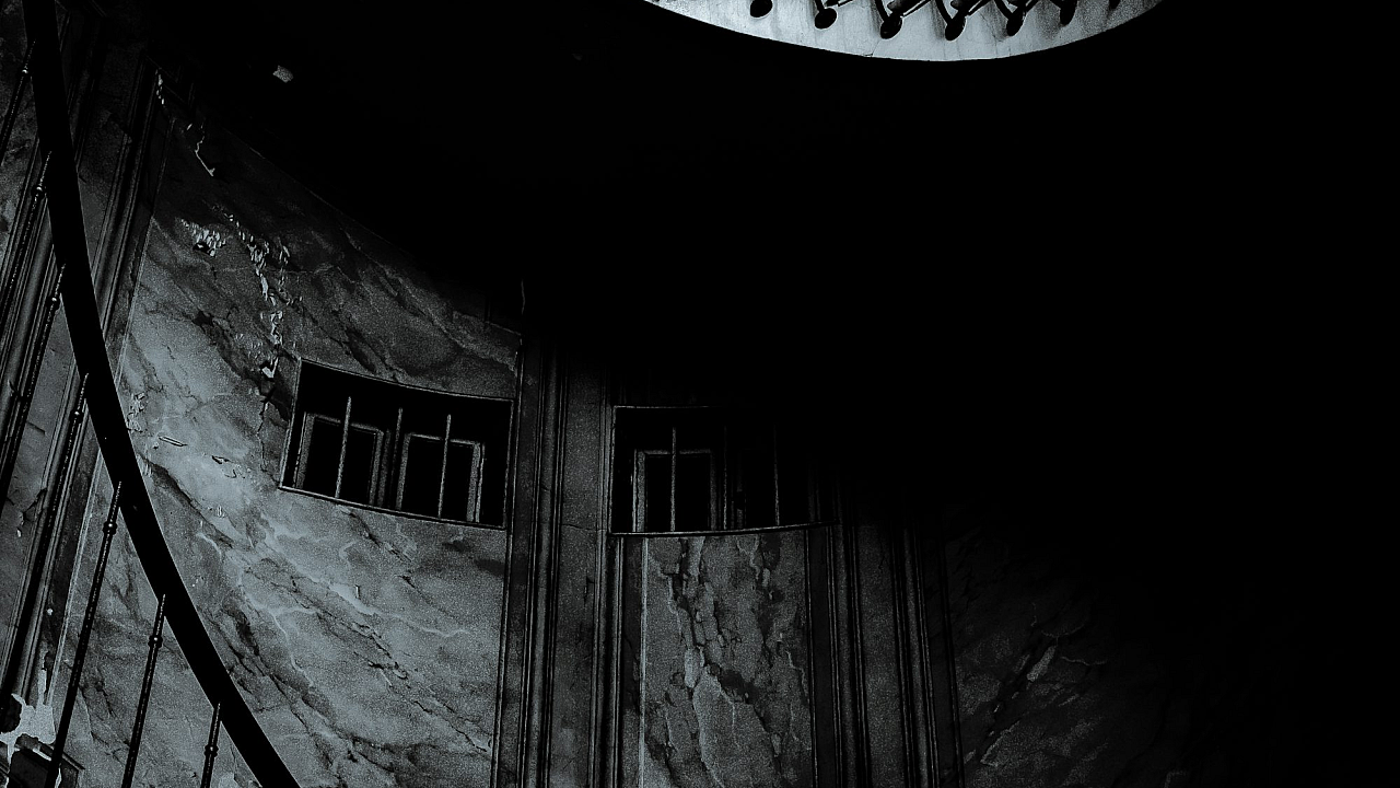 A dramatic and elegant wallpaper featuring a black spiral staircase with intricate black metal railings. Perfect for adding a touch of gothic or modern style to any room.