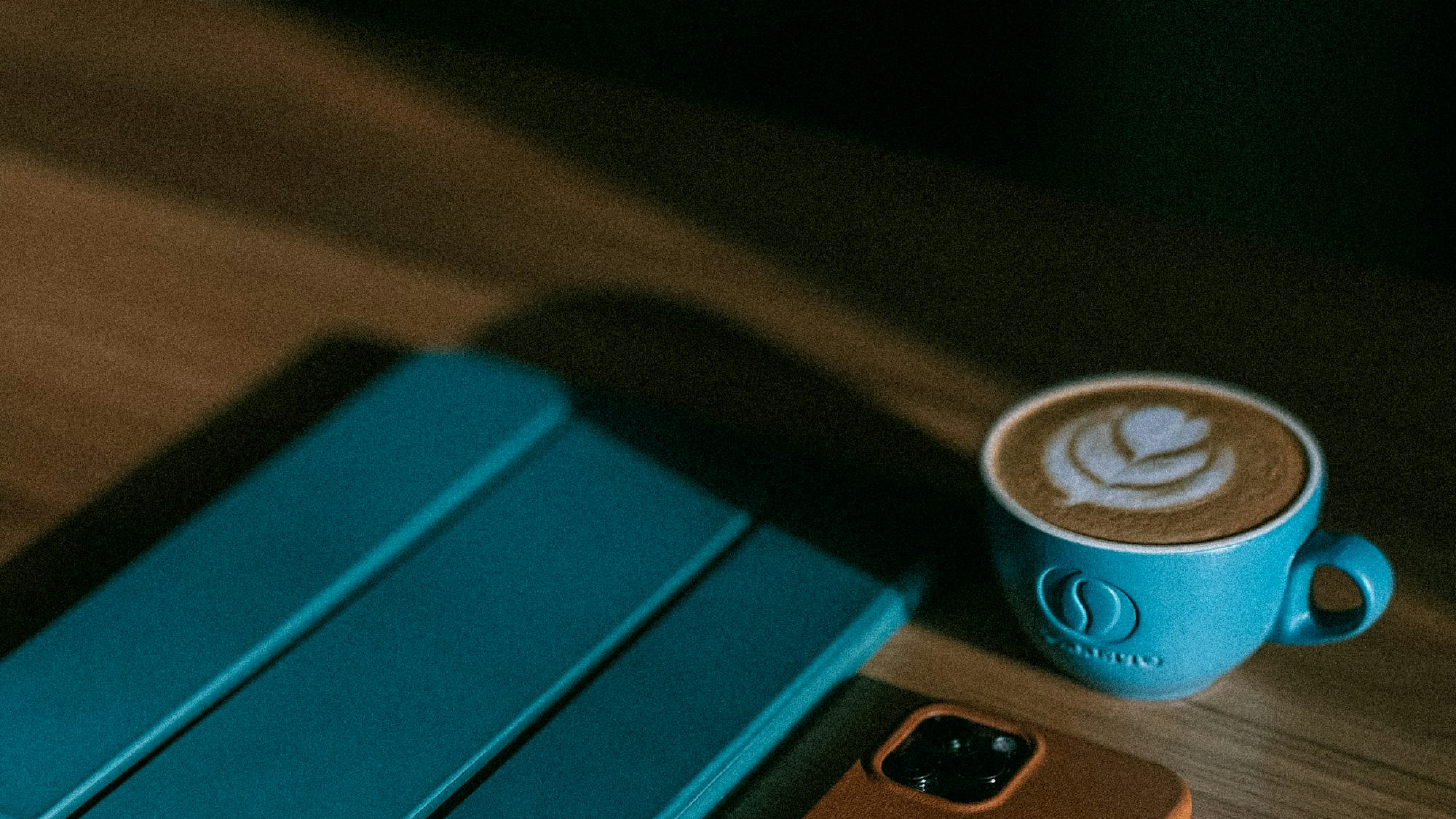 This wallpaper showcases a blue and brown leather flip case elegantly resting on a brown wooden table. The image offers a sophisticated and textured aesthetic.