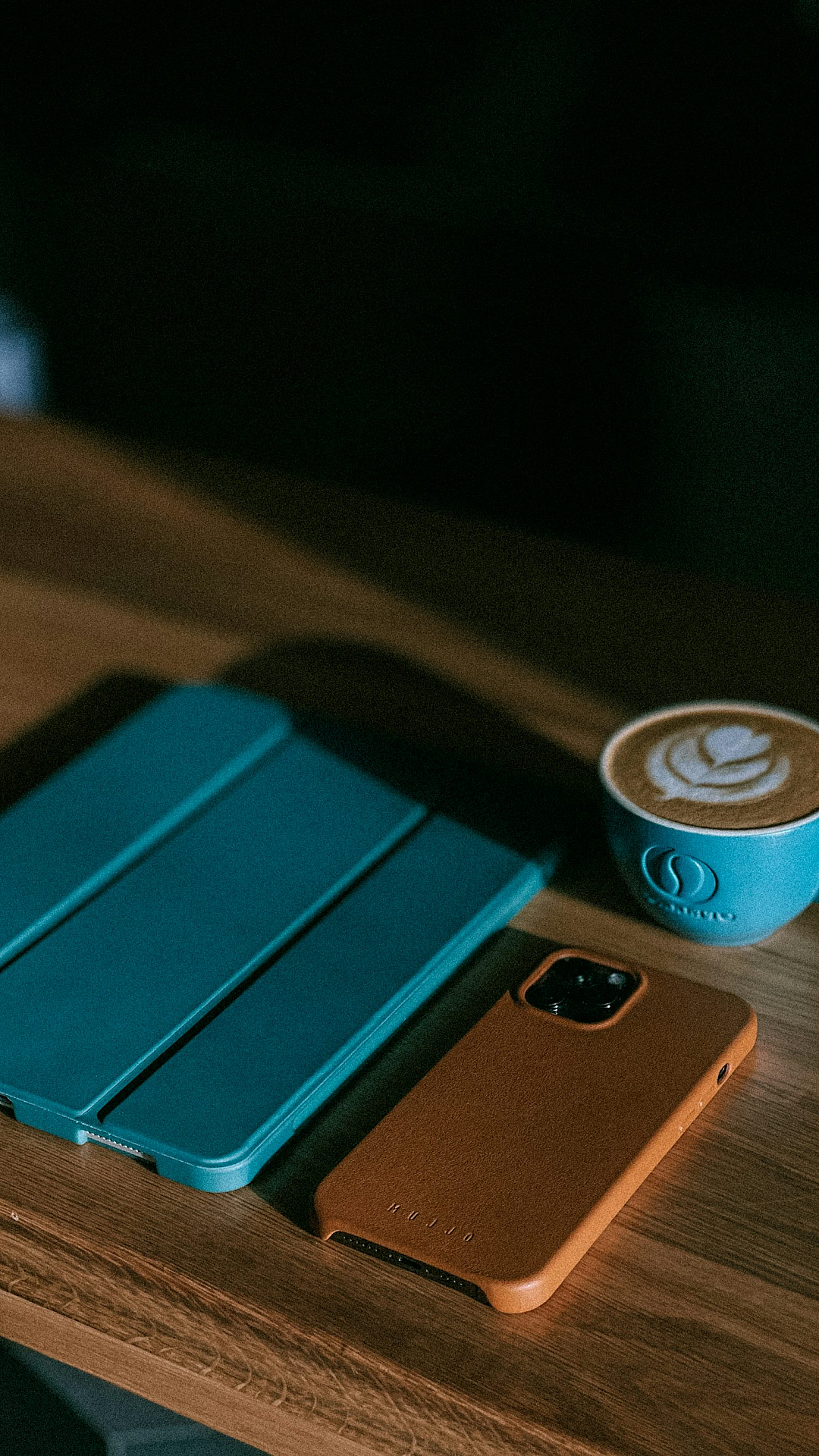 blue leather, brown leather, flip case, wooden table, brown wood, phone case, leather texture, wallpaper, background, mobile phone