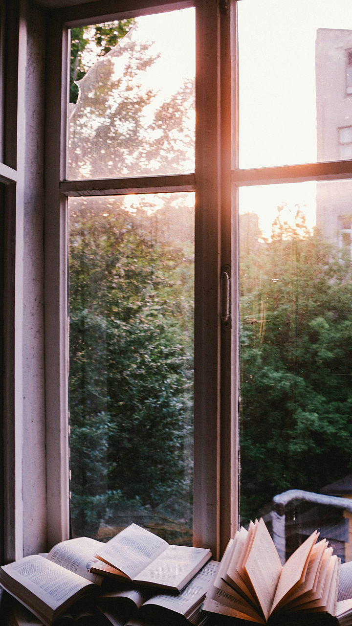 books, window, sunset, reading, cozy, calm, peaceful, golden hour, interior, literature