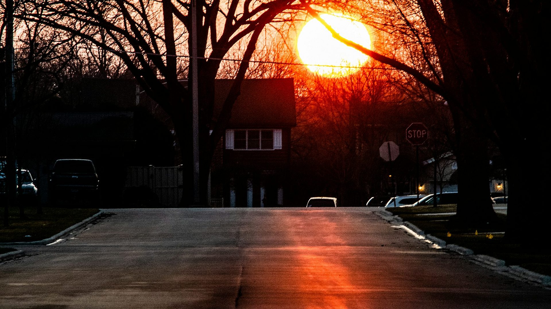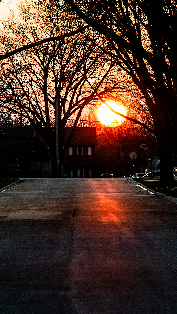 A captivating wallpaper featuring brown trees silhouetted against a gray concrete road under the night sky. A perfect blend of dark and moody tones.