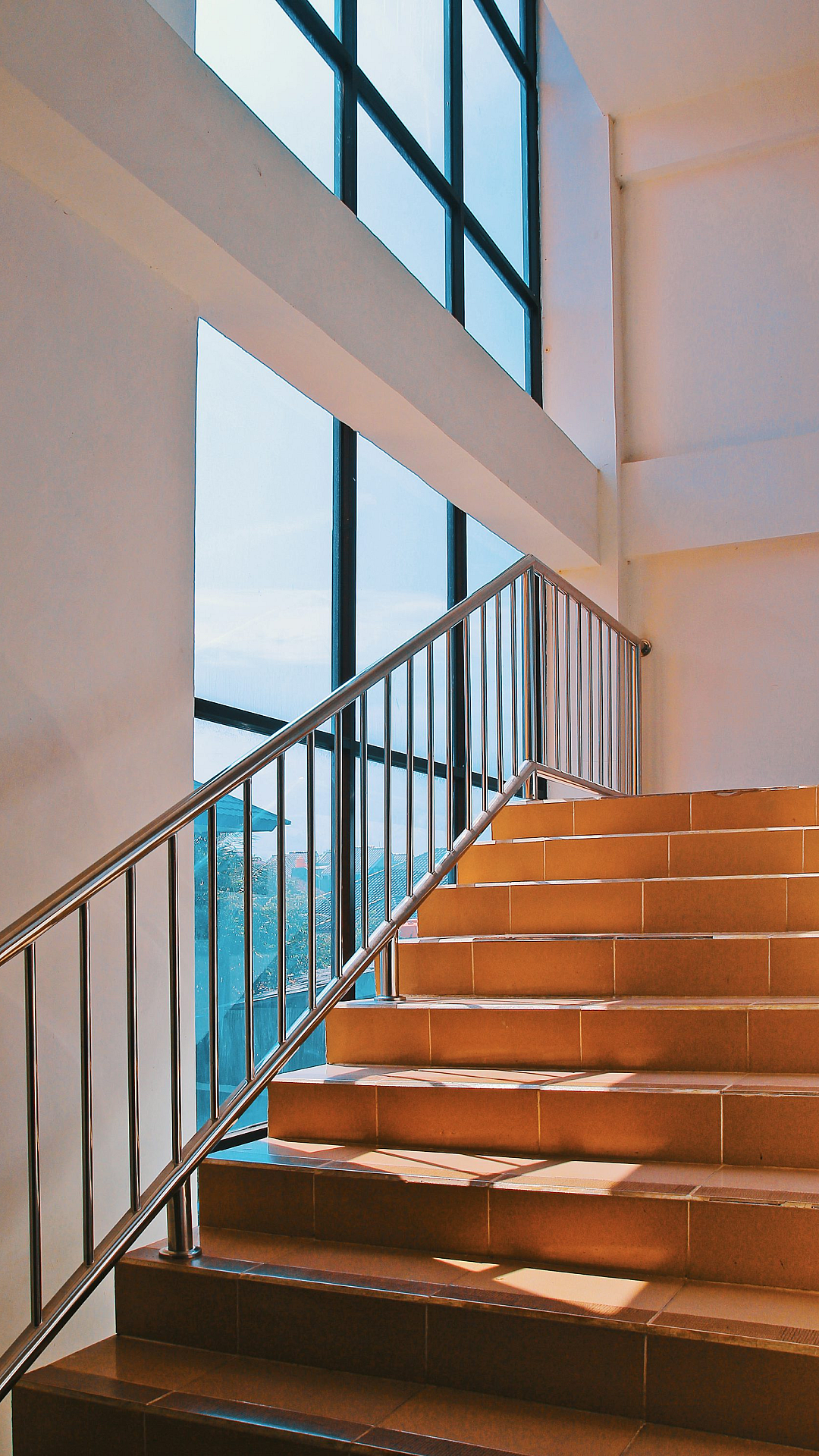 A stunning wallpaper featuring a brown wooden staircase leading down towards a tranquil body of water under the daytime sun. Enjoy this serene scene!