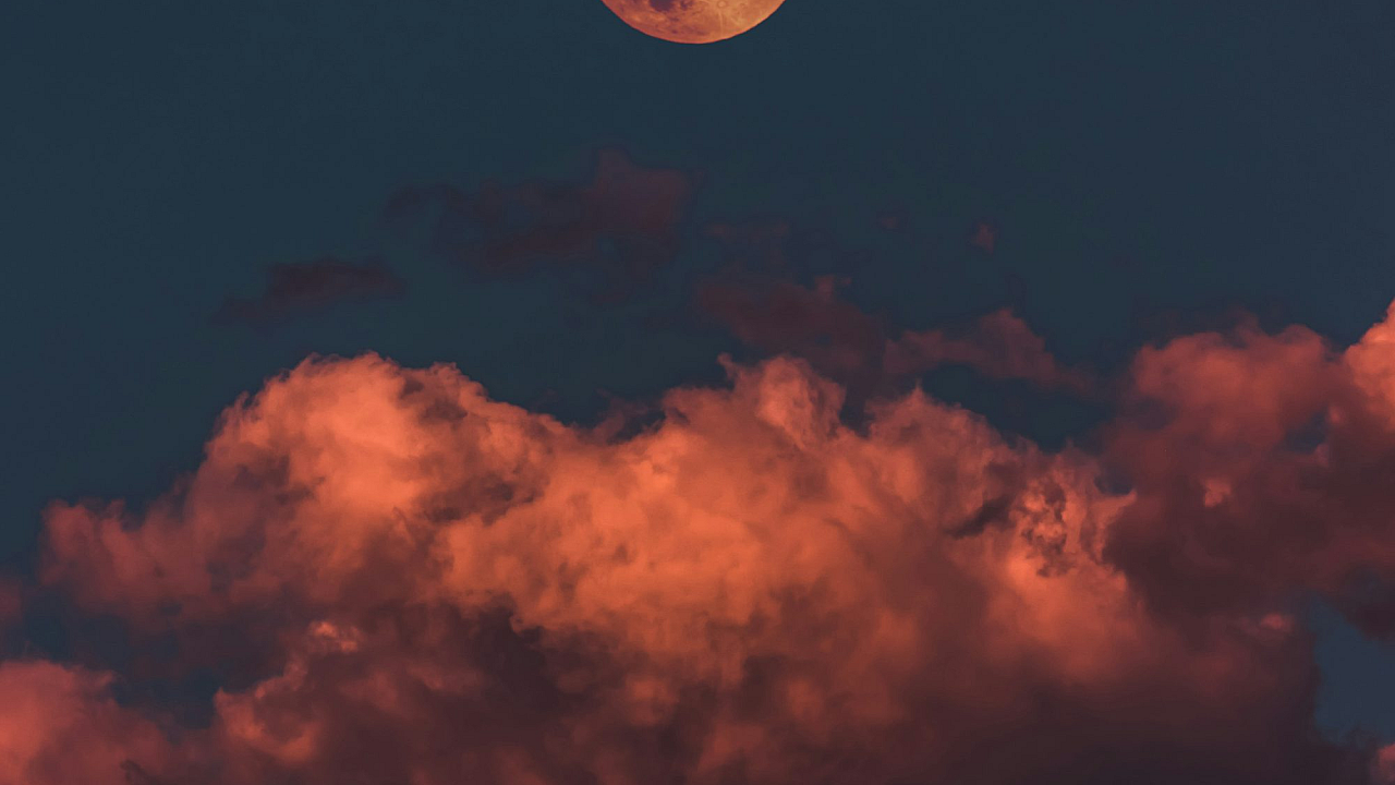 A captivating wallpaper featuring a full moon partially obscured by fluffy clouds, creating a serene and mysterious night scene.