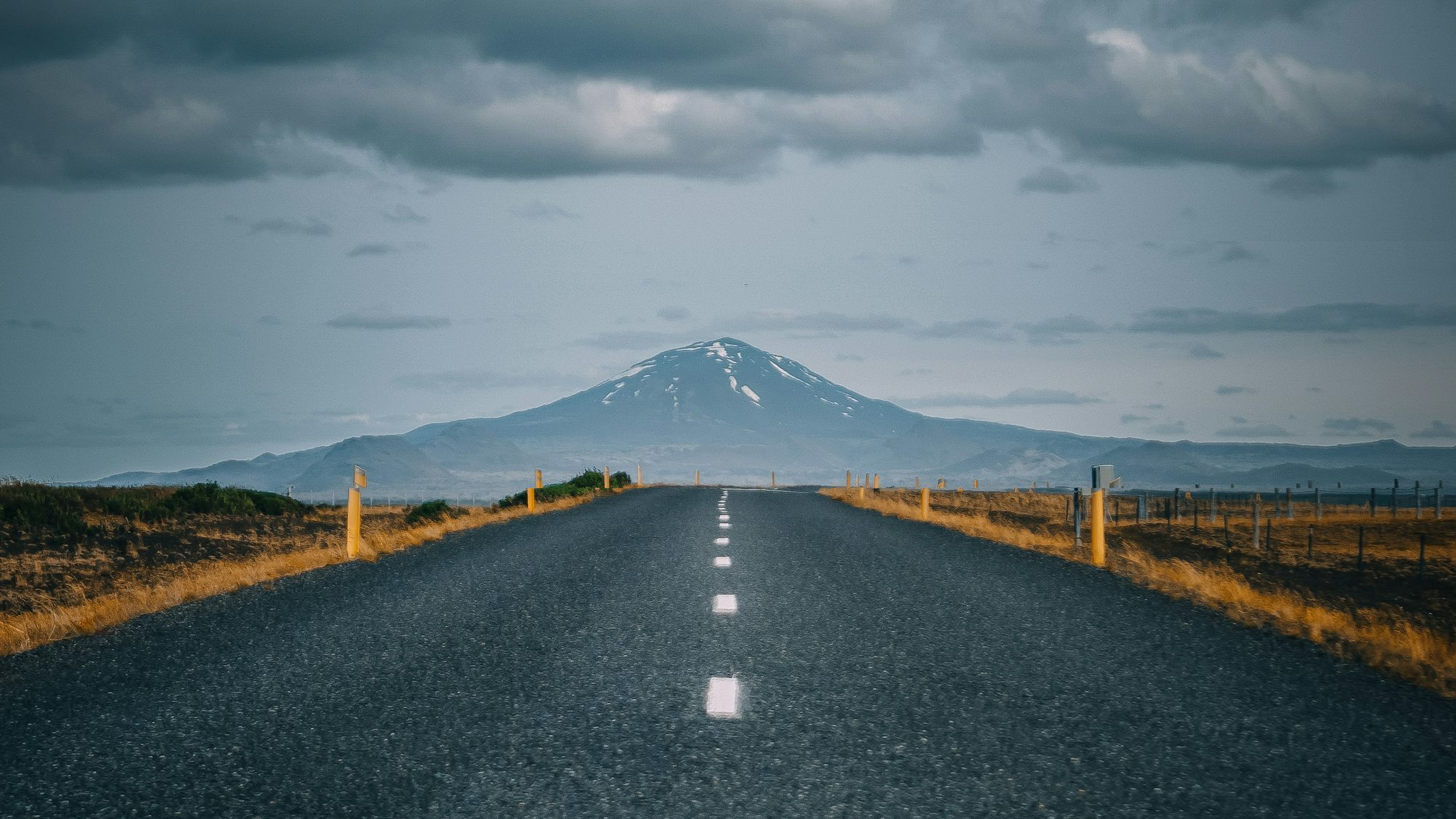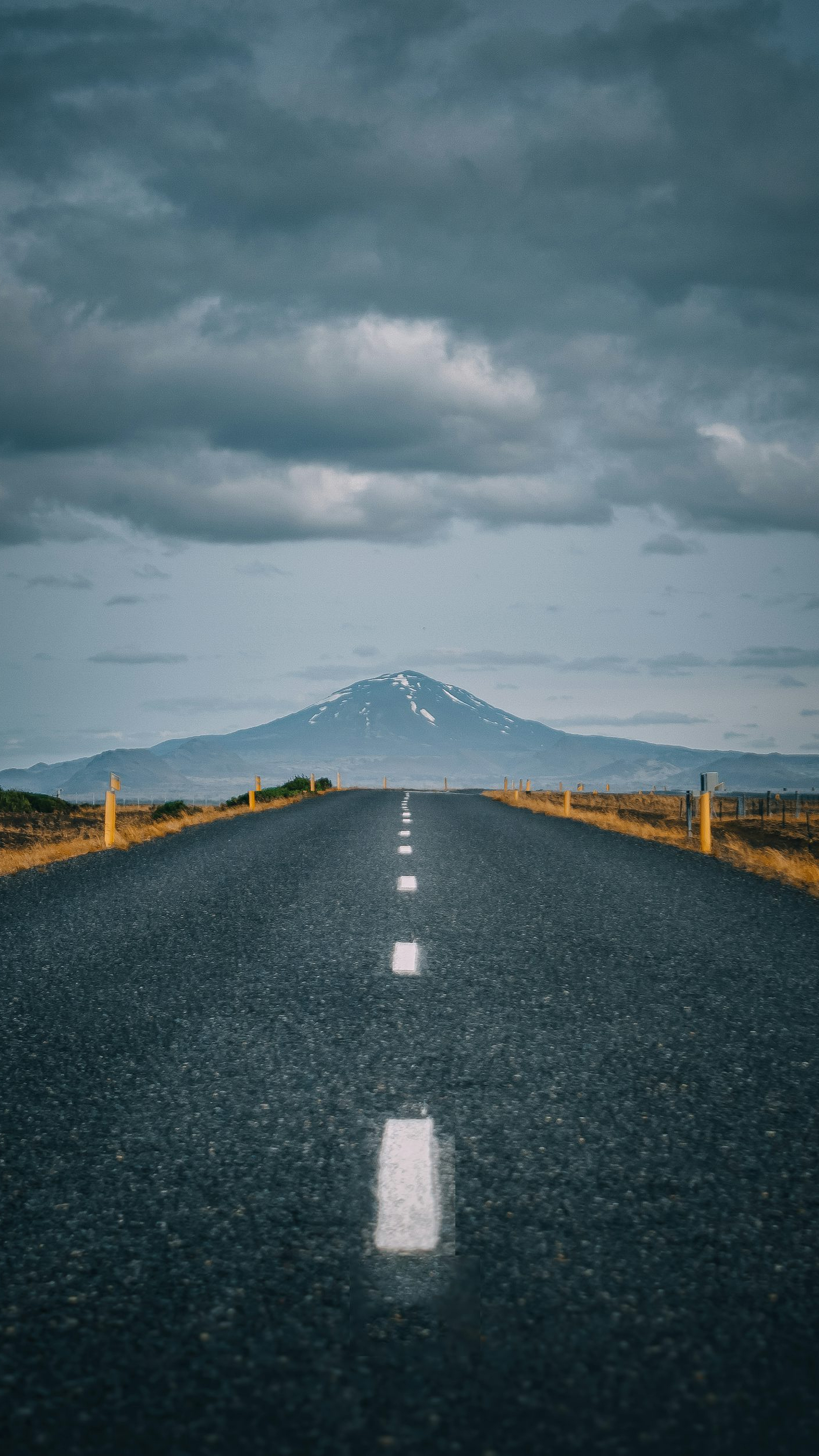 A moody and atmospheric wallpaper featuring a gray asphalt road stretching towards a gray cloudy sky. Perfect for a minimalist or dark aesthetic.