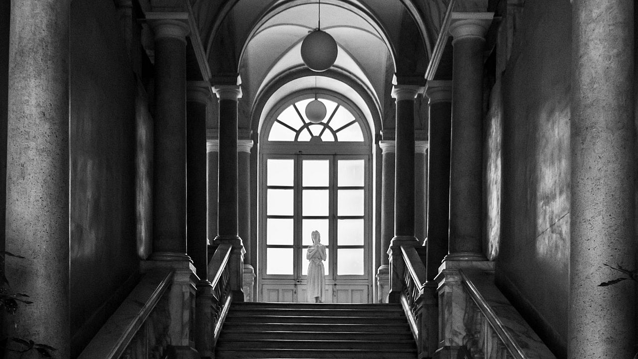 This wallpaper features a stunning grayscale image of a wooden staircase, offering a simple yet elegant design for your desktop or mobile device. Its minimalist aesthetic adds a touch of vintage charm.