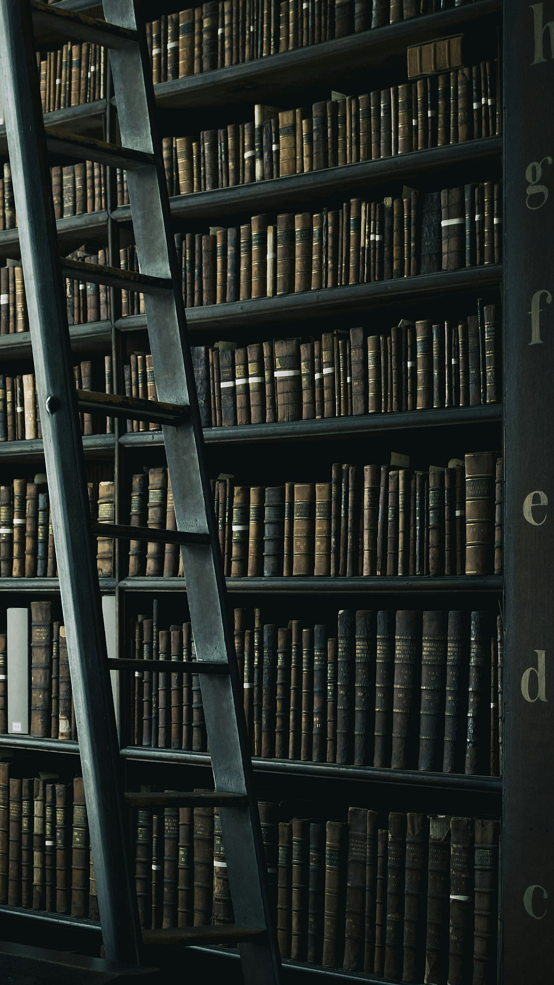 A captivating wallpaper featuring a black wooden ladder leaning against a well-stocked library shelf, evoking a sense of cozy reading.