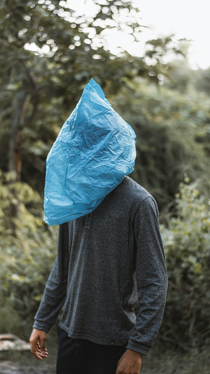 A mysterious and intriguing wallpaper featuring a person shrouded in a blue plastic bag. Surreal and abstract, perfect for a unique aesthetic.