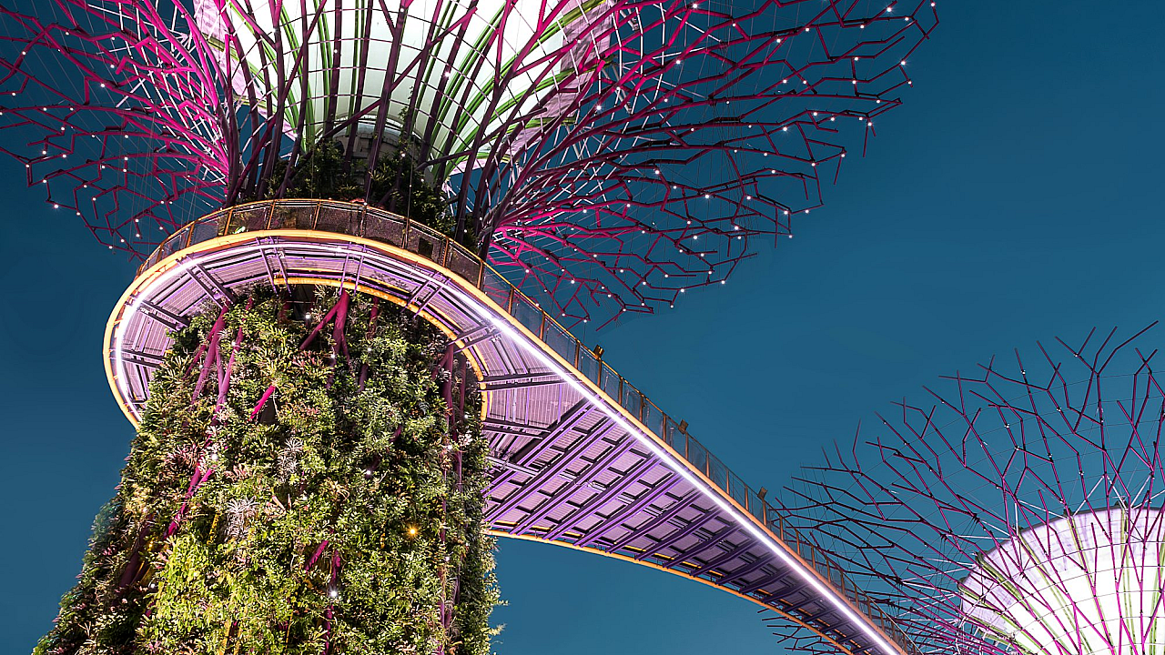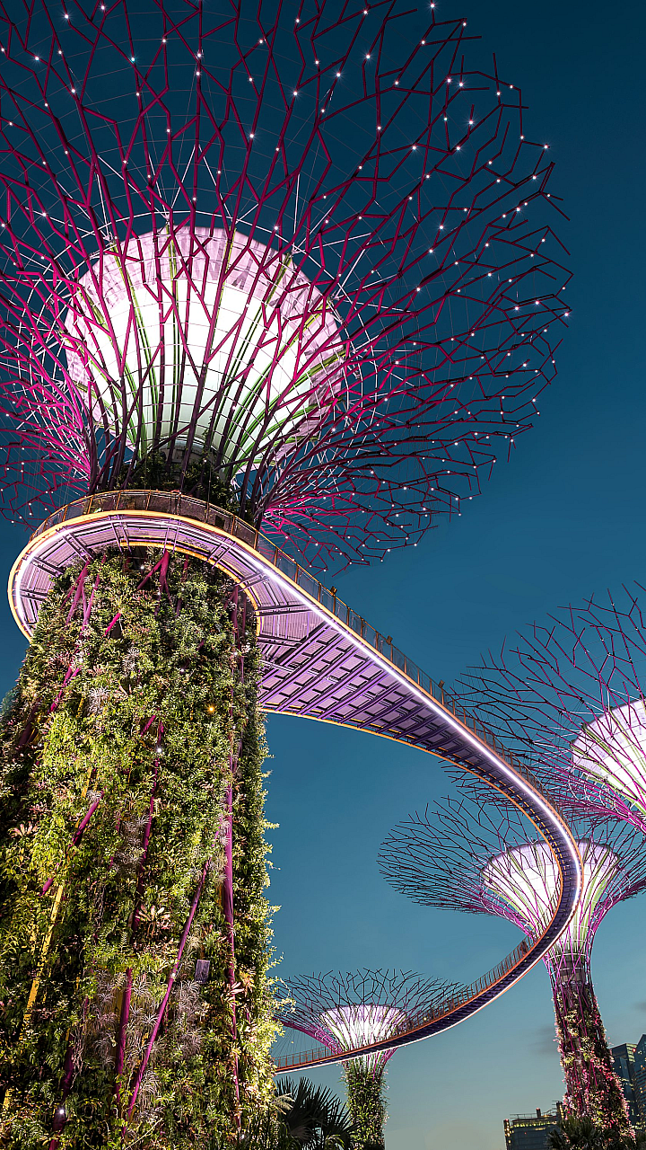 Experience the enchanting beauty of Singapore’s landmarks at night, illuminated with mesmerizing purple tree lights. This wallpaper captures a stunning cityscape scene.