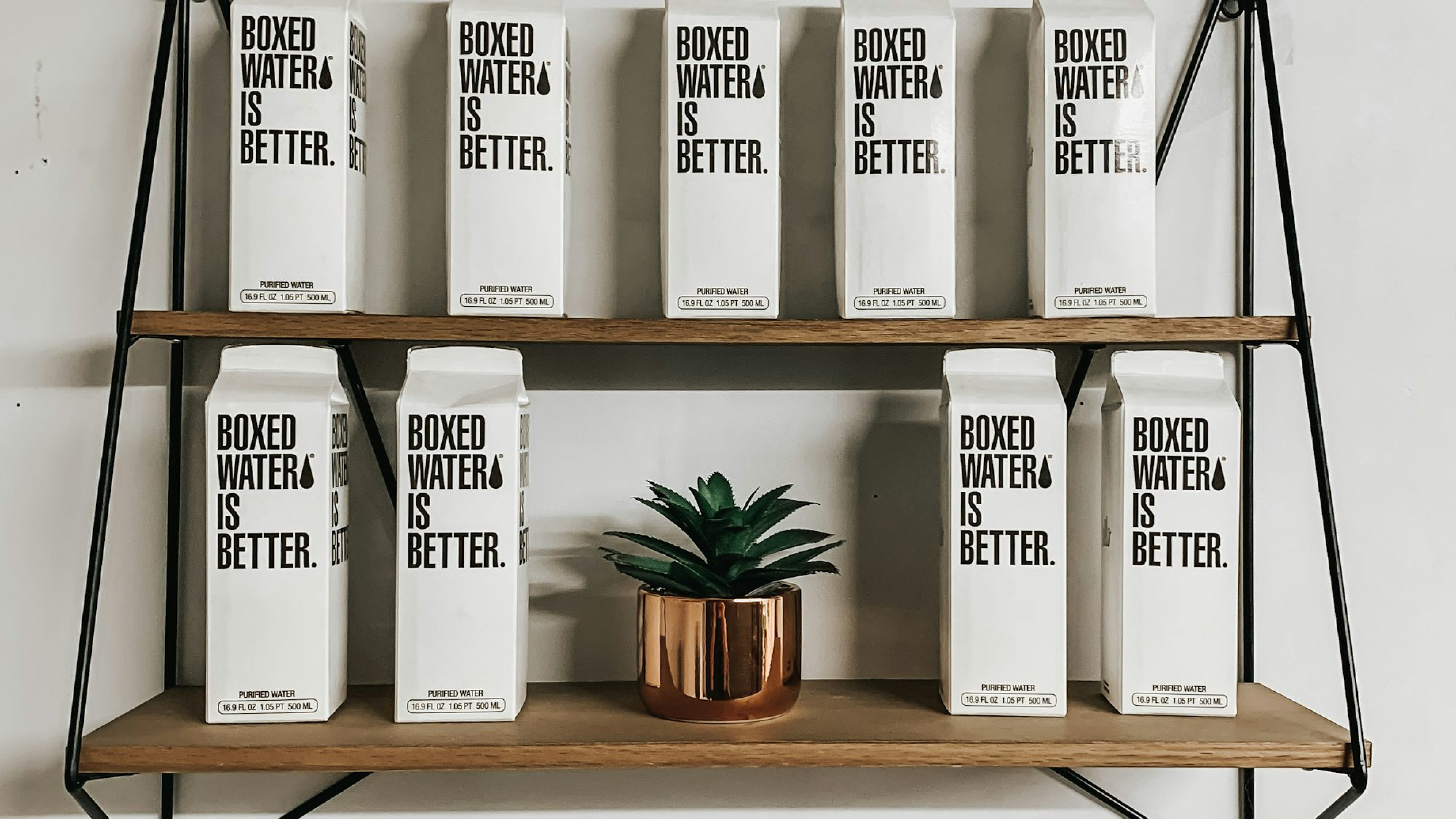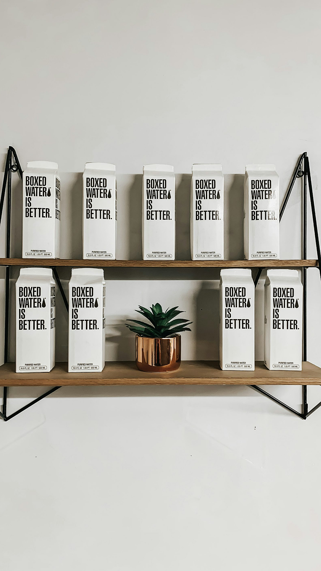 This wallpaper features a rustic scene of neatly arranged white and black labeled boxes on a brown wooden rack, perfect for a minimalist or vintage aesthetic.