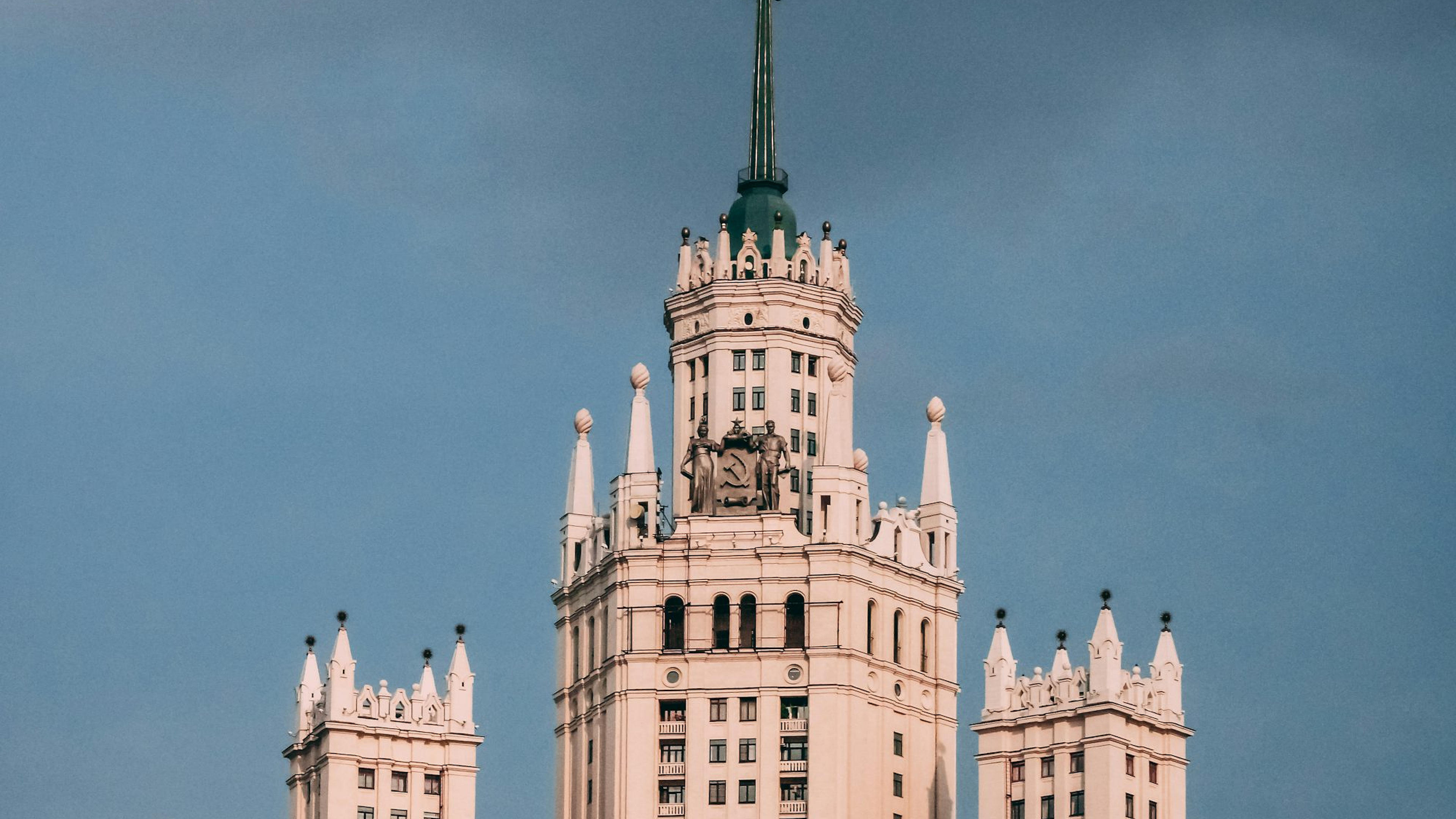 This wallpaper features a minimalist image of a white and green concrete building set against a vibrant blue sky. A perfect image for a modern and clean aesthetic.