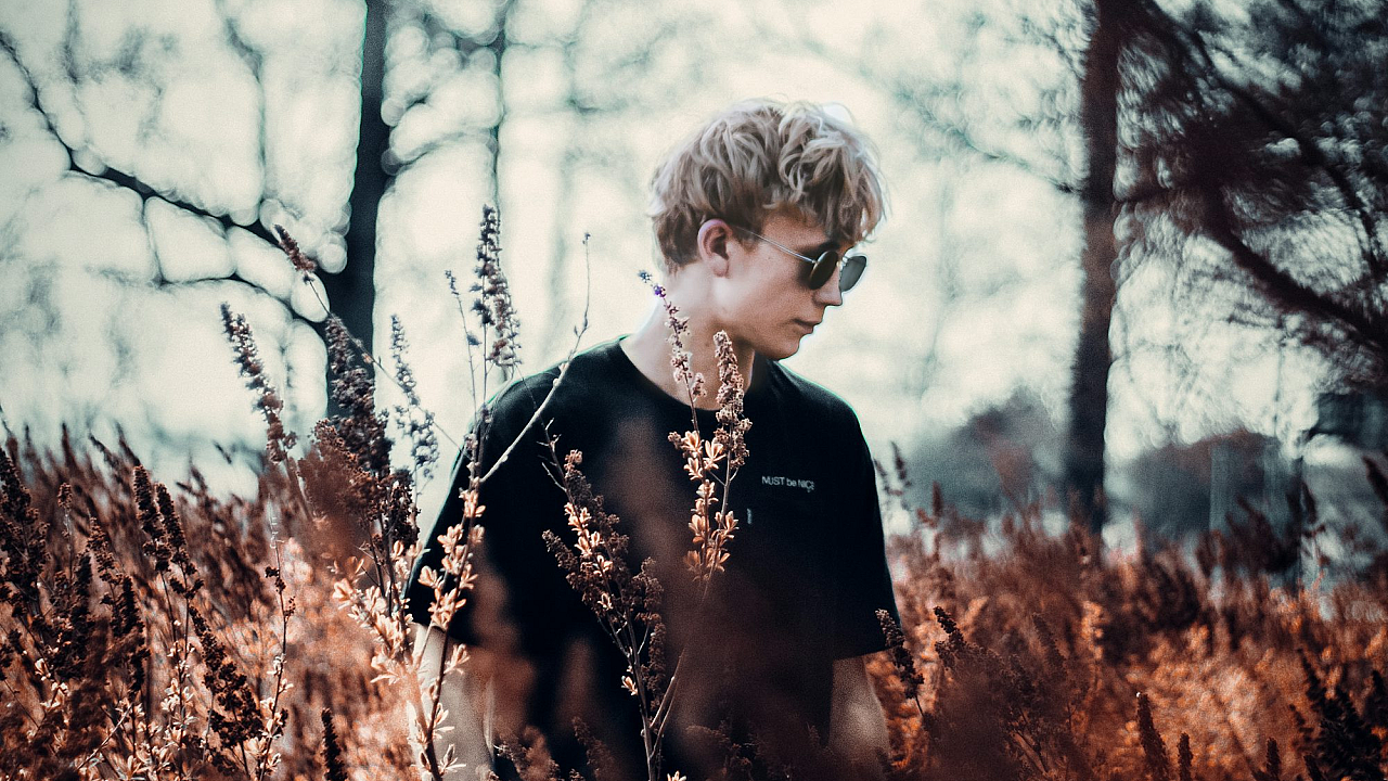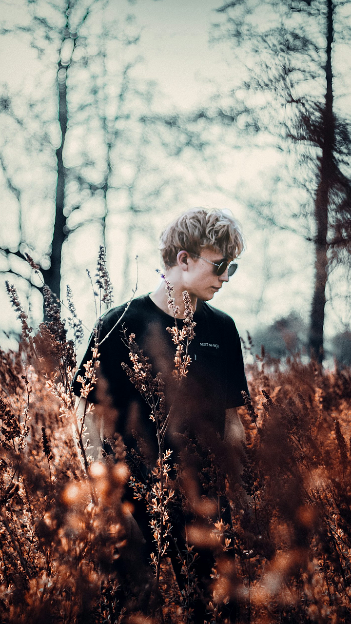 A stunning wallpaper featuring a woman in a black long-sleeved shirt standing serenely in a brown grassy field under the daytime sun.