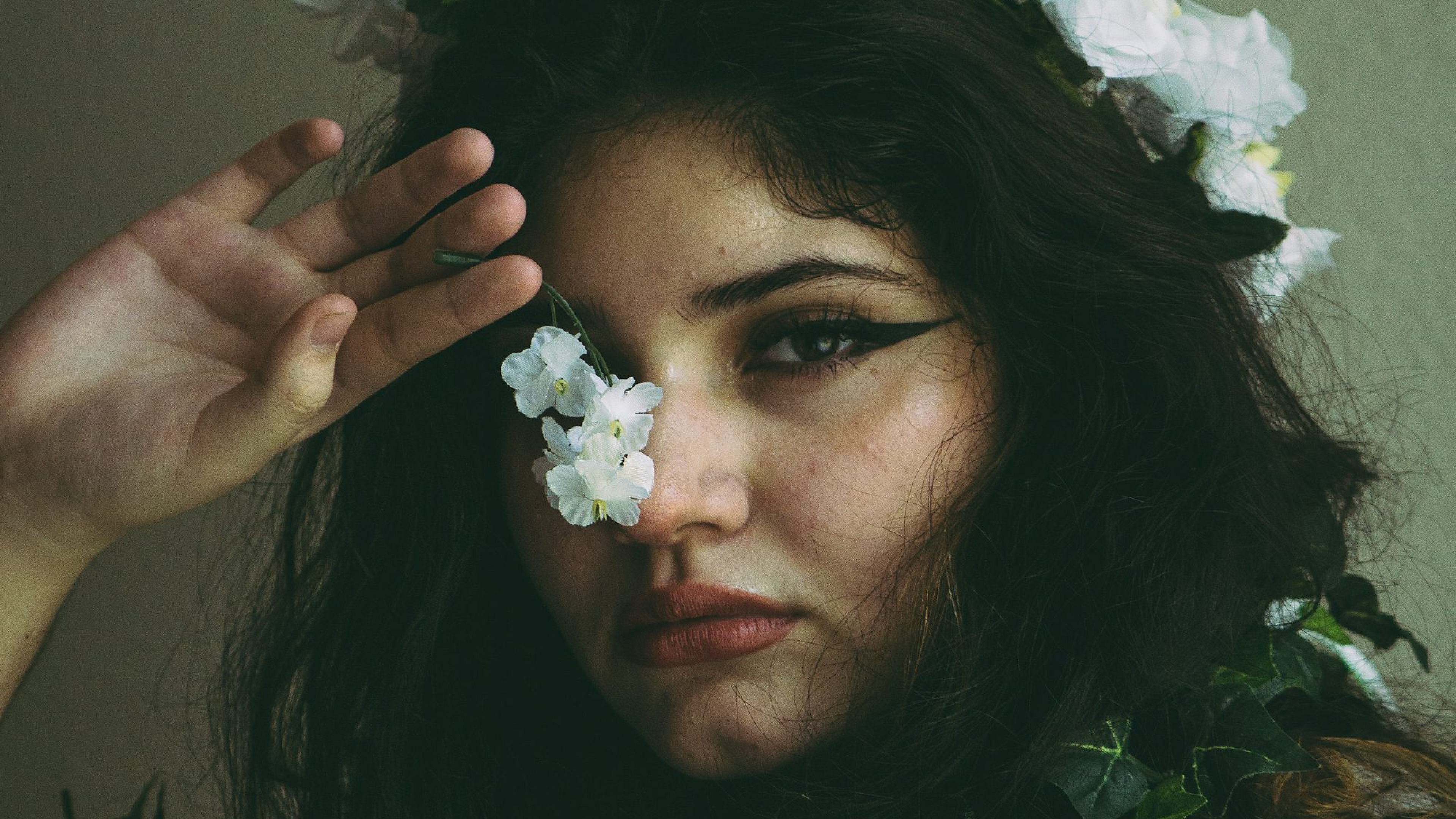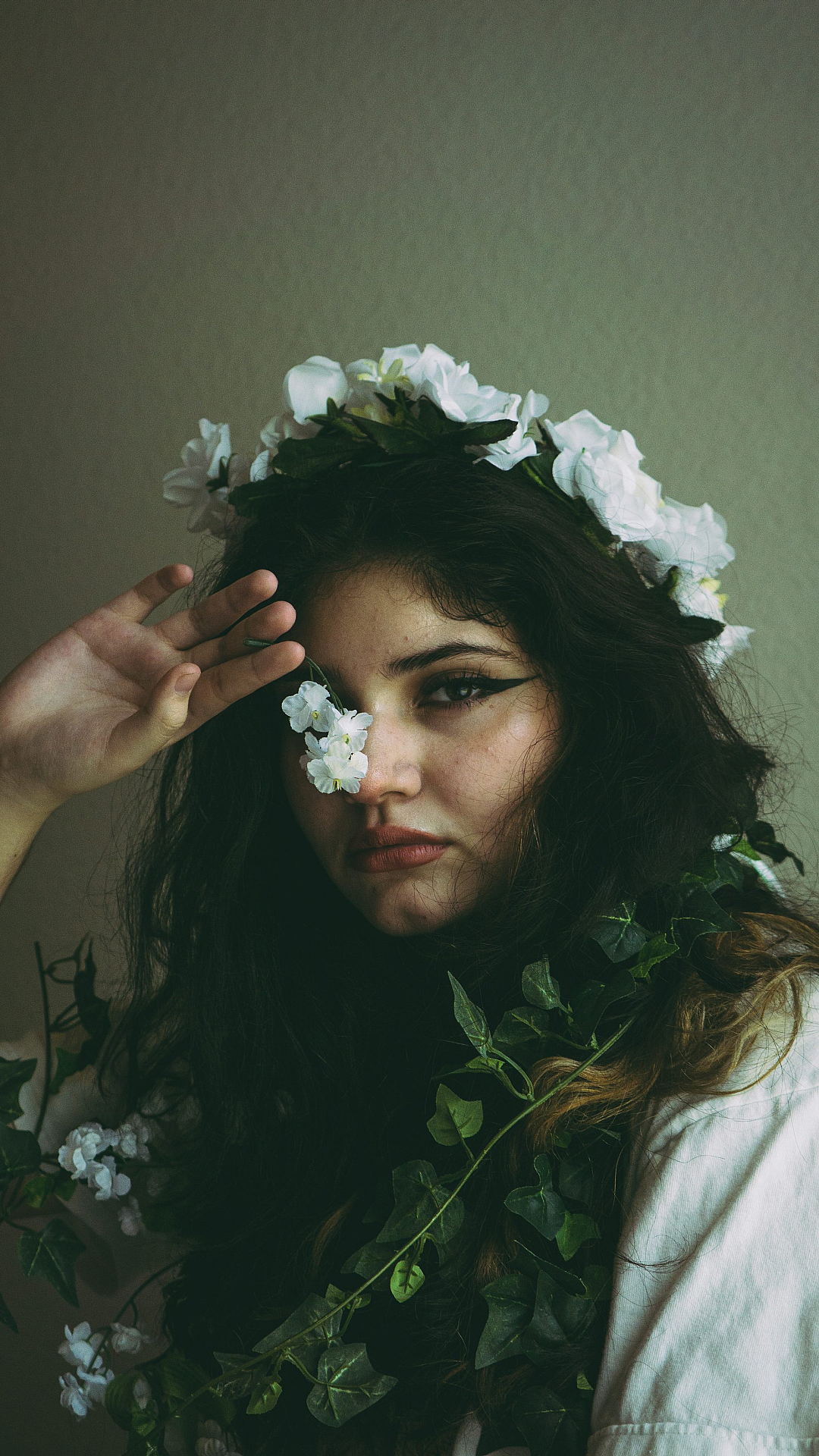 woman, white shirt, white flower, ear, portrait, wallpaper, minimal, elegant, simple, aesthetic