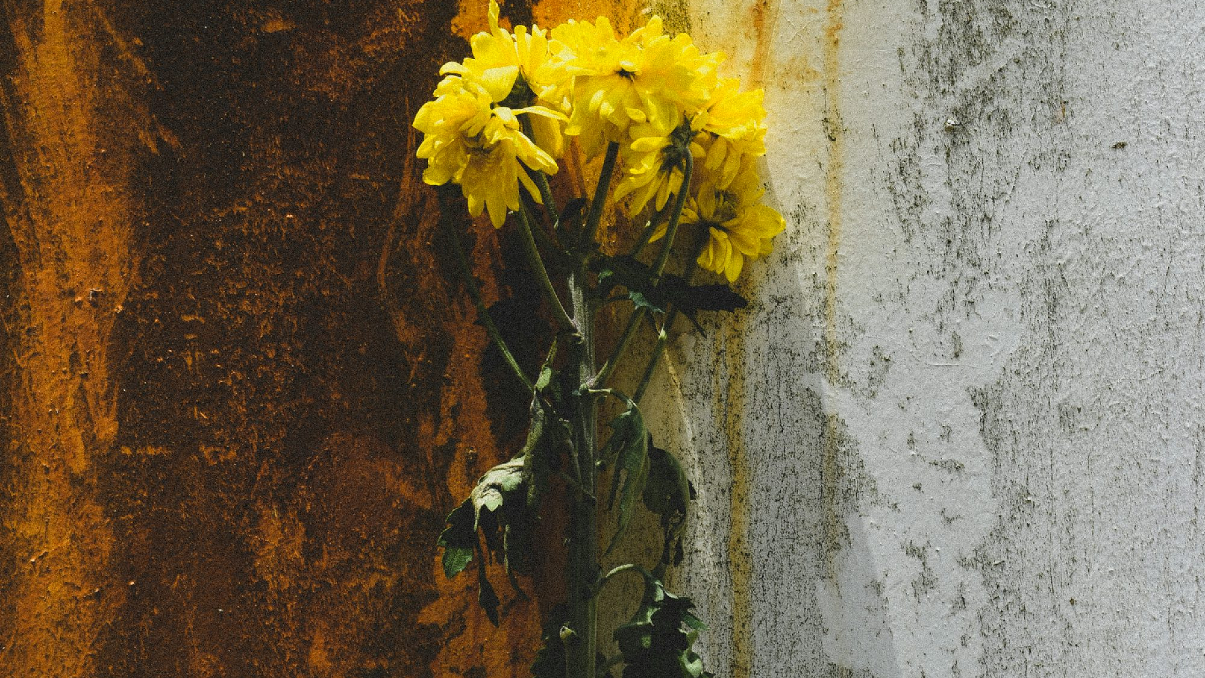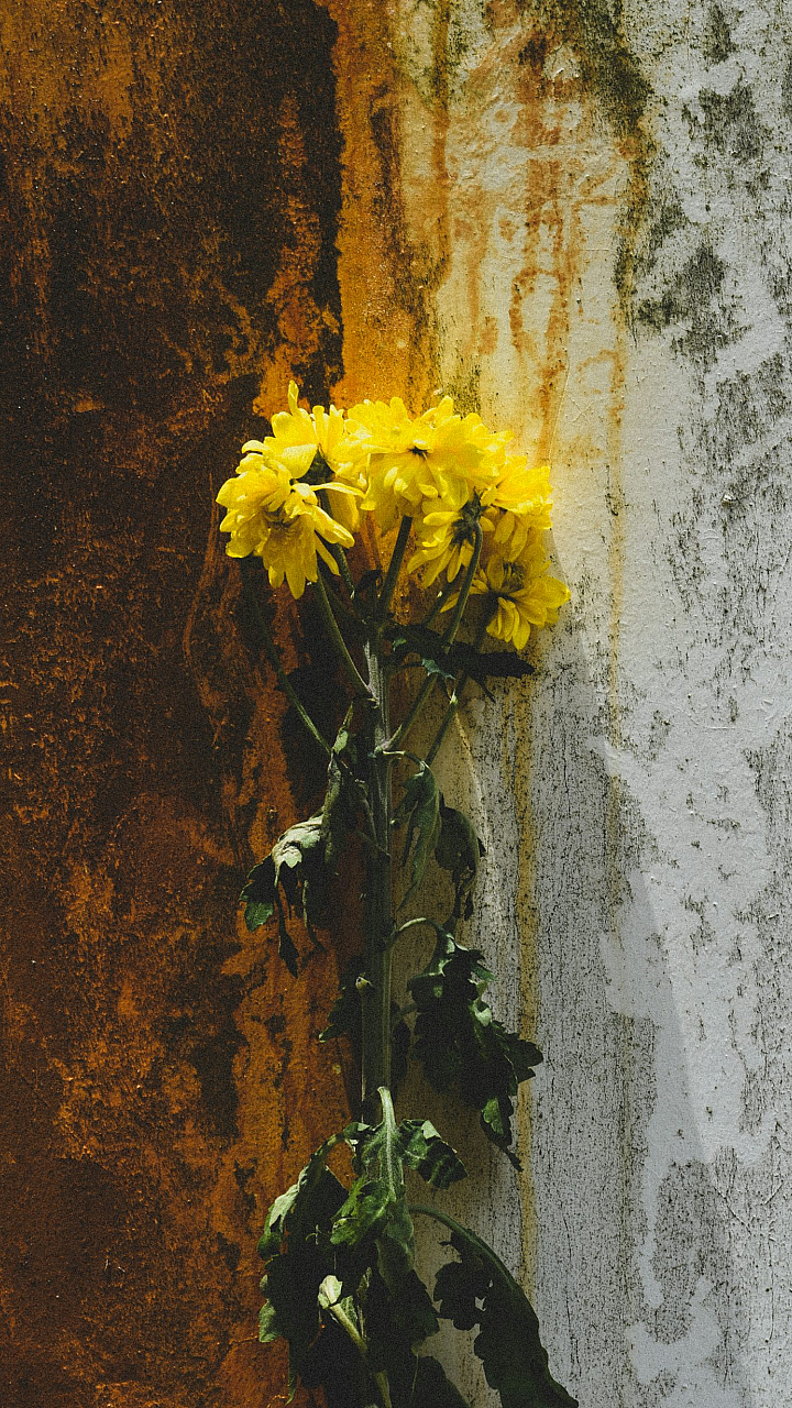 yellow flower, brown wall, concrete texture, floral wallpaper, nature wallpaper, wall art, flower background, concrete background, spring wallpaper, yellow aesthetic