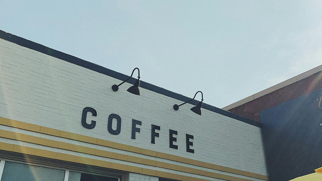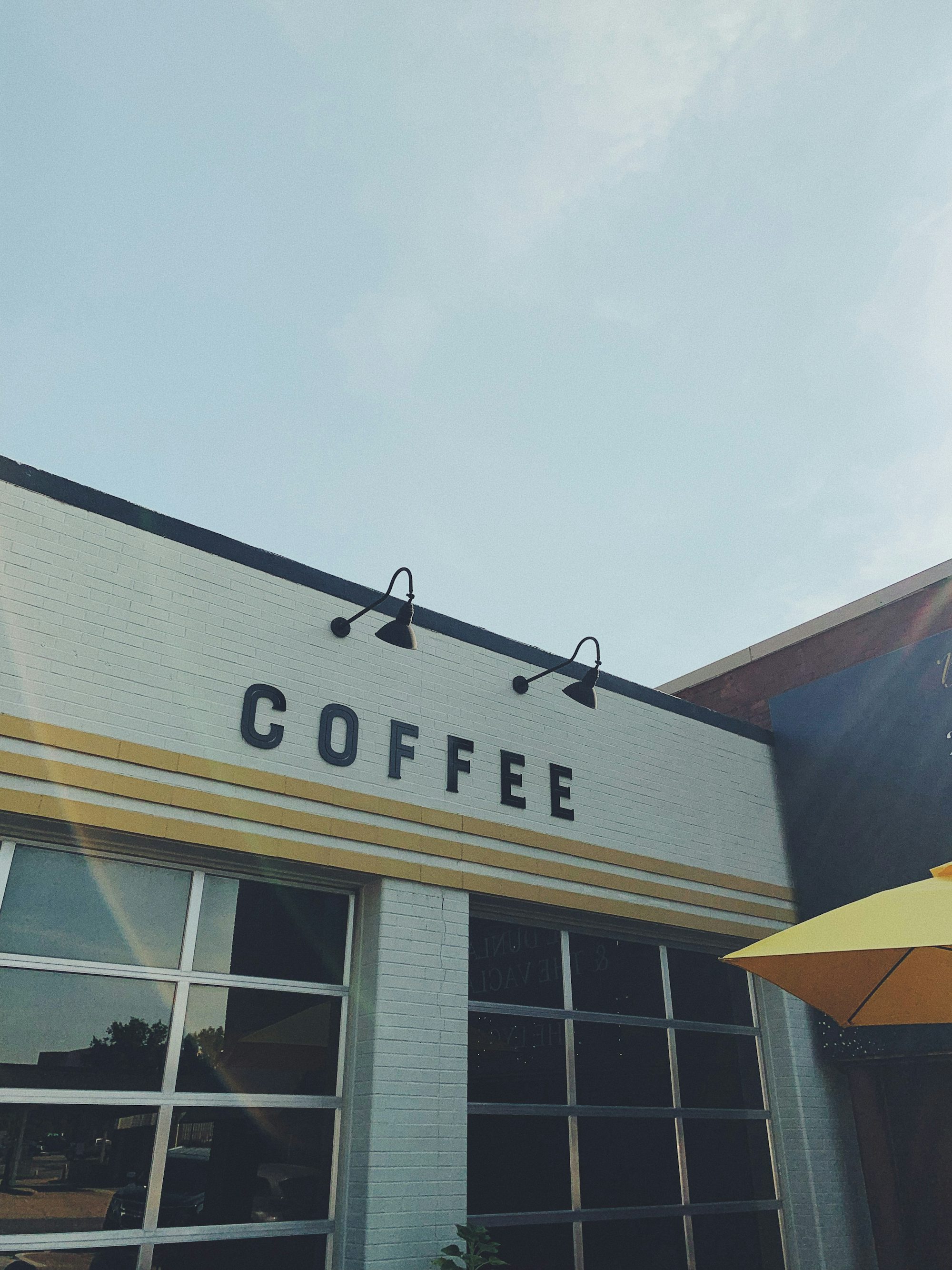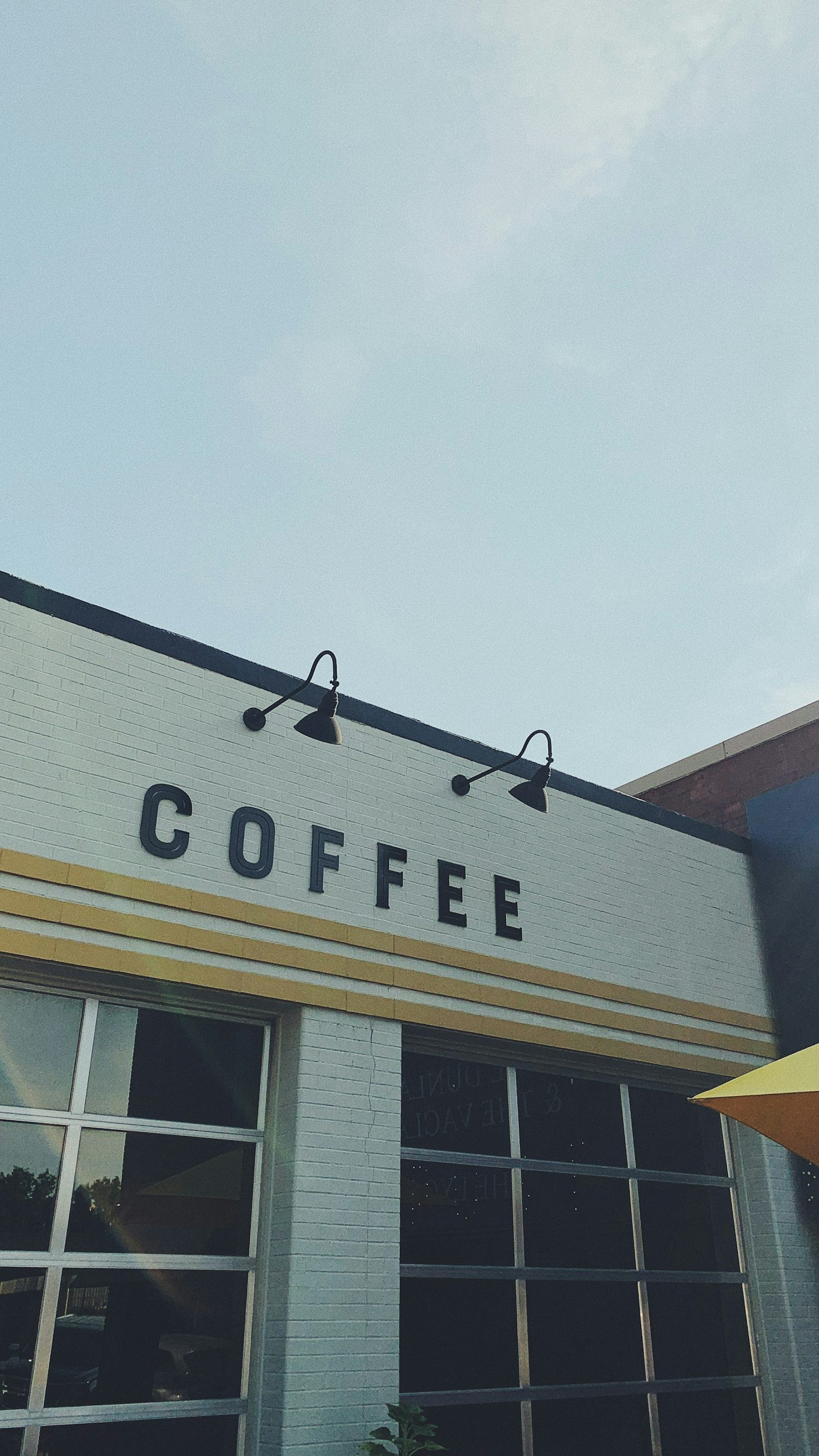 A cheerful wallpaper featuring a bright yellow umbrella standing out against a backdrop of a charming blue and white building. Perfect for a sunny and uplifting mood.